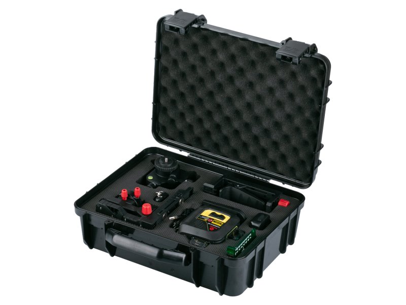 profesionáln 4D - ALL LINE - 360° laser se zeleným paprskem 2x horizontální rovina + 2x vertikální rovina - paprsek je promítán ve všech rovínéch v rozpětí 360° samonivelační rozsah ±4°, přesnost 0,2 mm/m, třída přesnosti II dosah ve vnitřních prostorech 30 m, s laserovým přijímačem (26209) v pulzním režimu až 50 m 1/4" a 5/8" závit pro uchycení na stativ odolnost proti vodě a prachu IP 54 obsah balení : přepravní kufr, Li-ion baterie 2600 mAh, nabíječka, profesionální multifunkční držák, otočný ministativ v rozsahu 360°, dálkové ovládání, cílová destička mm / inch, brýle