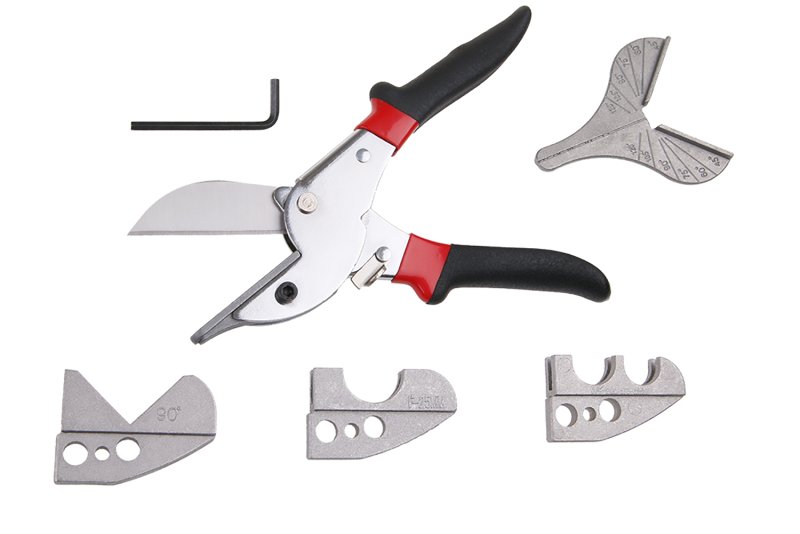 Kleště na PVC lišty a trubky, kleště s kaleným ostřím a výměnnými čelistmi, pro střihy PVC lišt s nastavitelnými úhly a PVC trubky, ergonomické rukojeti, blistr.