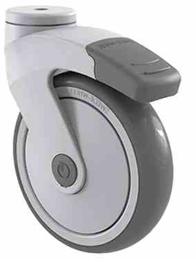 Přístrovová kola s plastovou vidlicí s uchycením na jeden šroub, na kuličkovém ložisku s plastovým běhounem - otočné s brzdou kola.