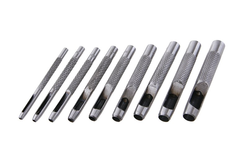 Ocelové děrovače na kůži. Děrovače jsou opatřeny bočním výhozem odpadu. Sada 9ks. Průměry děrovačů: 2,5mm, 3mm, 4mm, 5mm, 6mm, 7mm, 8mm, 9mm, 10mm.