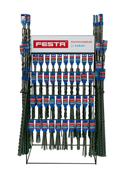 praktický stojan na různé druhy vrtáků a sekáčů SDS+ a MAX, které se na stojan zavěšují 40 pozic - háků, boční držáky na dlouhé vrtáky kompaktní rozměry 62,5 x 89 x 44 cm možné umístění na pult, samostatně stojící nebo zavěšení na stojan