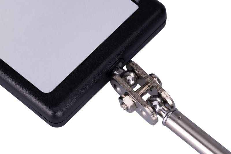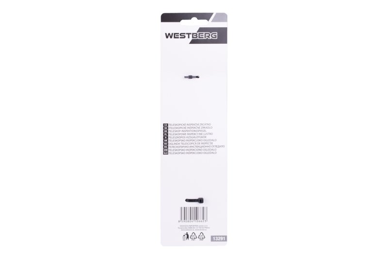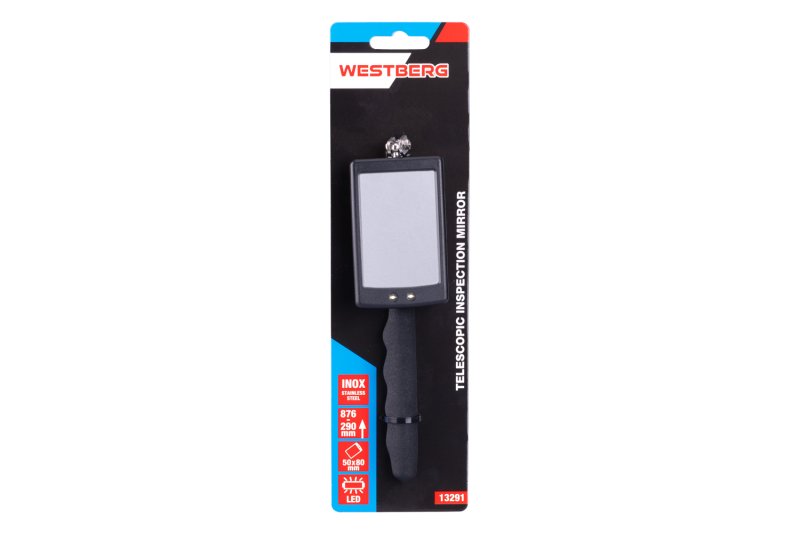 zrcátko na teleskopické násadě se dvěma LEDkami rozsah délky násady 290 - 876 mm, rozměr zrcátka 50 x 30 mm teleskopicá část z nerezové oceli, ergonomická pogumovaná rukojeť napájení LED osvětlení 2 x baterie CR 2032(součástí balení)